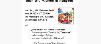 Fasching für Senioren - Herzliche Einladung zum bunten Nachmittag am 05.02.2026 um 14.00 Uhr im Pfarrsaal St. Michael mit Musik und...